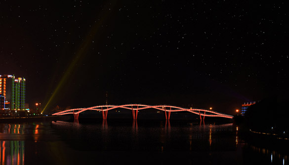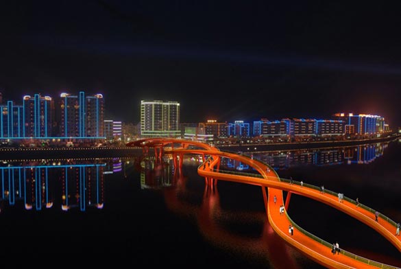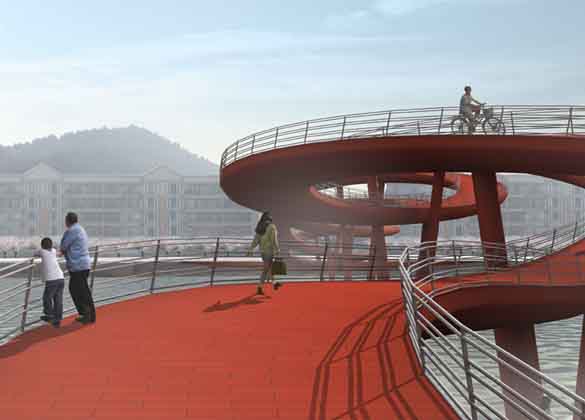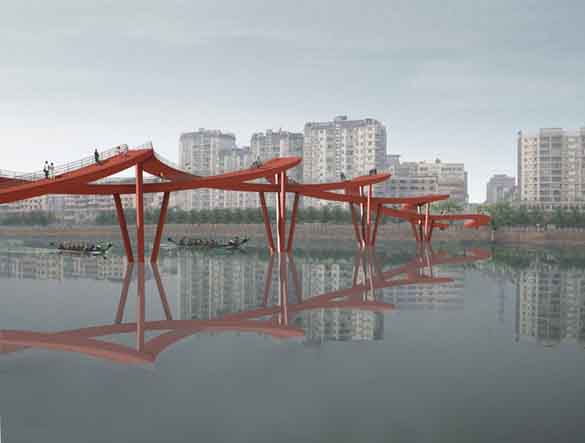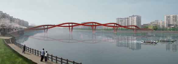 На сликите можете да го видите новиот мост на реката Нанхе во Ксинјин, Кина кој е дизајниран од тимовите на WXY Architecture студиото од Њујорк, и Weidlinger Associates Consulting Engineers.