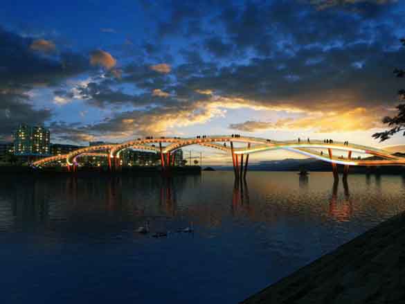 Тоа се всушност два посебни моста, кои се испреплетени и потсеќаат на нишка од ДНА код, а кривините на мостот треба да го претставуваат течението на самата река.