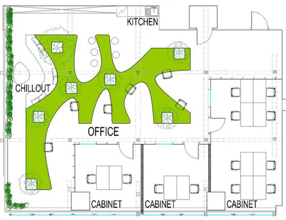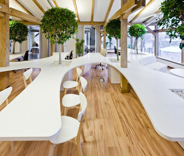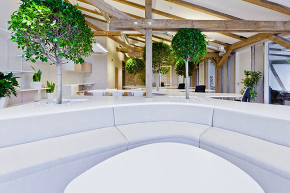 Комерцијалниот дизајн и просторното планирање на затворени простории веќе извесно време се заменуваат со целосно отворени простории кои овозможуваат високо ниво на соработка. Архитектонското студио OpenAD е задолжено за одличниот изглед на оваа канцеларија чии елементи се од органско потекло. Растенијата обезбедуваат чист и свеж воздух, додека истовремено овозможуваат да се работи ефикасно и без прекин. Како резултат на тоа, оваа затворена градина создава освежувачка, мирна средина која поттикнува креативност и посветеност на работата.