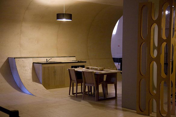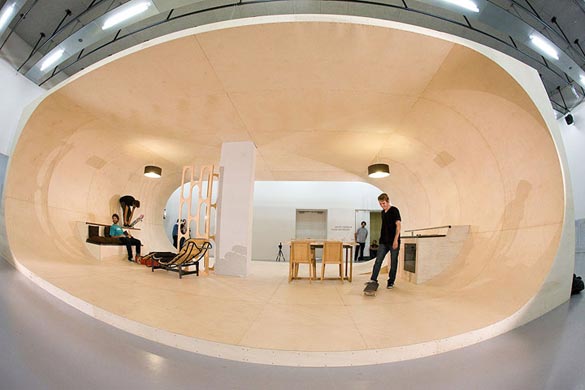 Оваа куќа е одлична за оние како што би рекле, шивеат за скејбордингот. Целото секојдневие ќе Ви биде поврзано со скејбординг, со самото тоа што куќата е поделена на три дела : првиот го вклучува дневниот престој со трпезарија и кујна, вториот спална и бања, а третиот дел е сала за скејтбординг. Специфично е тоа што не само салата моше да се користи за скејт, туку и просториите од другите два дела од куќата се обработени во форма на континуирана туба, заедно со вградениот мебел.