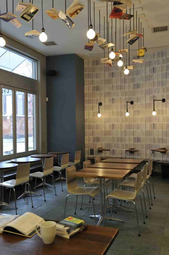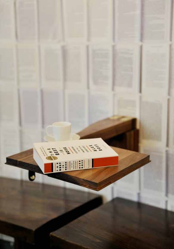 Интересен аспект во дизајнирањето на ентериерот на оваа книжарница е неформалното седење и уникатниот дизајн на соло-масички, кадешто на мир можете да си уживате во своите омилени дела. Тоа се всушност мали масички на расклопување, кои потсеќаат на книга која се отвора и затвора. Притоа, тие можат да се подигнат до ѕидот за време на разни изложби планирани во просторот на кафетеријата.