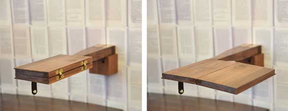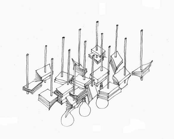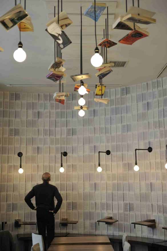 Самиот ѕид на кои се наожаат овие масички е кружен, а тапетите кои се на него, се принт од отворени страници од книги со различна боја.