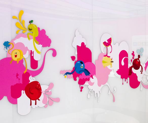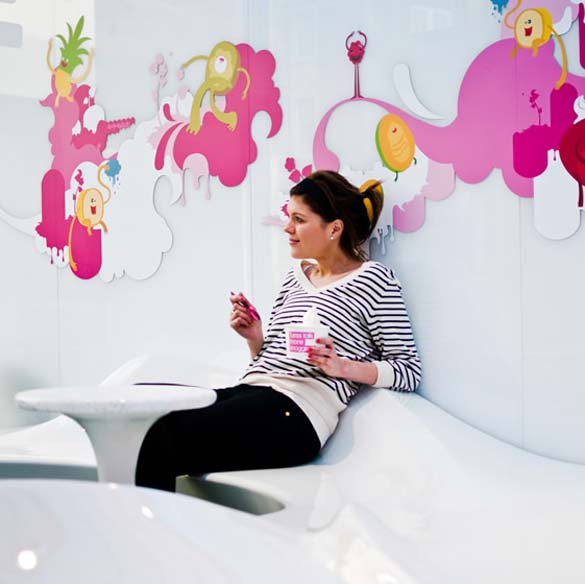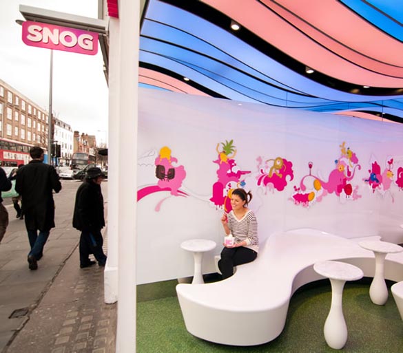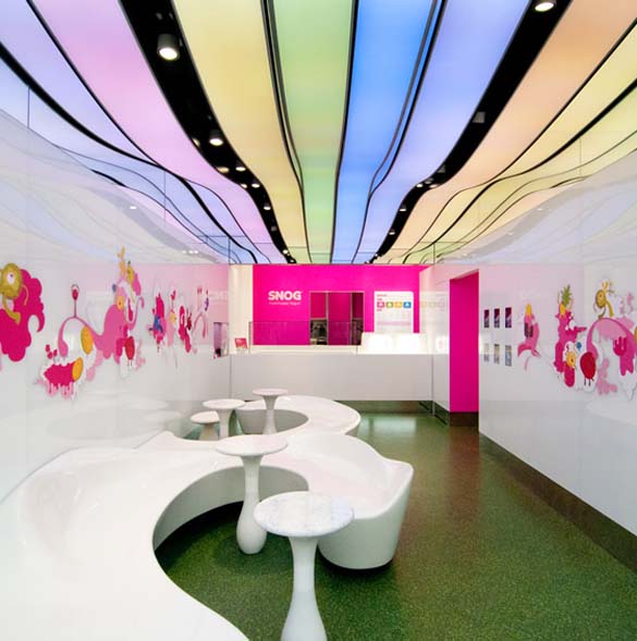 Светскиот производител на замрзант и овошен јогурт Snog, ја отвори својата шеста продавница. Уникатниот дизајн е дело на архитектонската фирма Cinimod Studio. Просторот кој им беше на располагање е долг, тесен и со излог на прометна улица во Челзи. Со цел да се привлече поголемо внимание кај минувачите, таванот е брановиден, со различна длабочина, и ленти во различна боја кои се образувани од ЛЕД диоди, кои го менуваат својот интензитет во зависност од музиката. Во континуитет, дизајнирана е клупа за седење која потсеќа на јогурт. Во продолжение следува целосниот изглед на продавницата. Уживајте. 😉