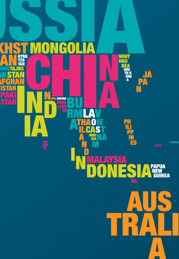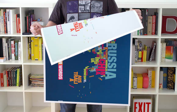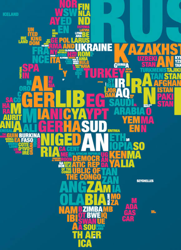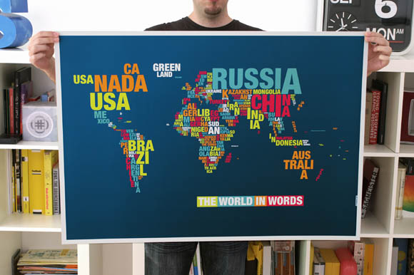 Алфабетската мапа на светот претставува спој на компонентите на географијата и типографијата. Обликот и големината на буквите се поставени така што кореспондираат со земјишната маса на соодветната земја. Мапата е двострана, темно сина од едната, а светло сина од другата страна. Пронајдете ја Македонија.