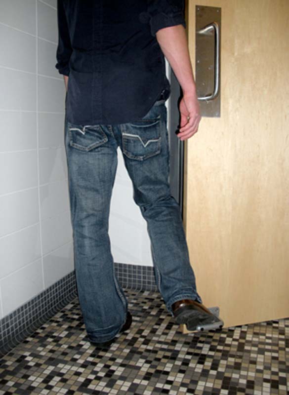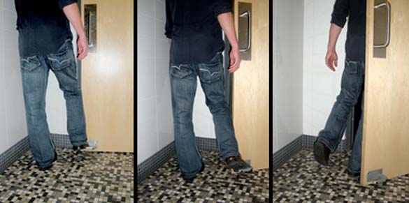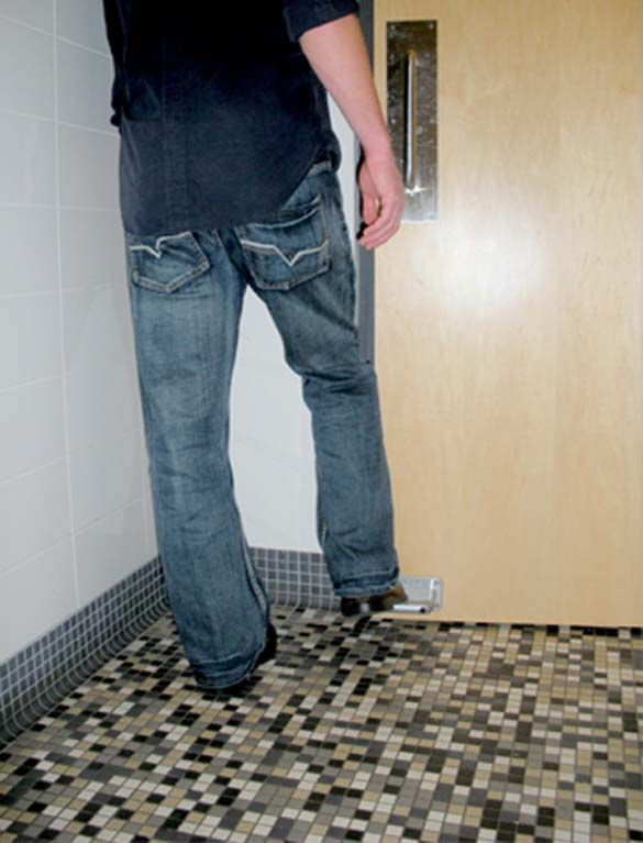 “Toepener” е корисен уред кој овозможува да се отворат вратите со нога. Дизајнот на L-облик го прави лесен за употреба овој уред. Едноставниот, рудиментиран уред овозможува излез од јавните тоалети, без допирање на валканите и полни со бактерии кваки. Дефинитивно треба вакви врати и по нашите јавни тоалети.