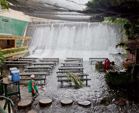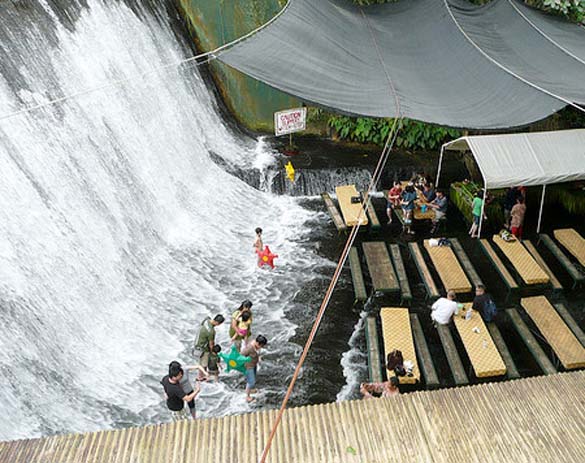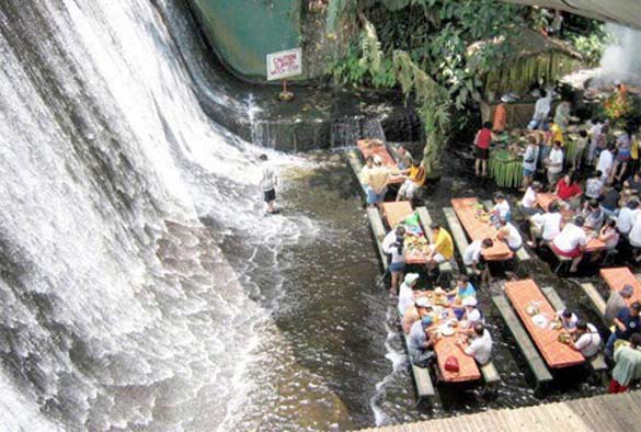 Овој интересен ресторан кој овозможува ново, убаво доживување и вистинско уживање во храната, се наоѓа во близина на вилата Escudero, на Филипините. Вкусната храна се сервира на масите кои се изработени од бамбус, и се сместени веднаш под водопадот. Замислете си уживање во специјалитети додека бистрата вода на водопадите нежно ги допира вашите нозе. Совршено!