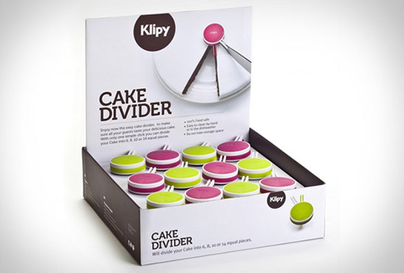 Овој мал, едноставен предмет од Klipy, овозможува лесно да го исечете колачот или тортата на еднакви парчиња. Сè што треба да направите е да го поставите делителот на средината на тортата и да го наместите граничникот за сечење на 6, 8, 10 или 14 еднакви парчиња.