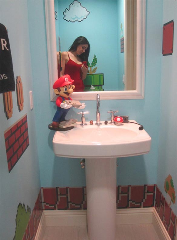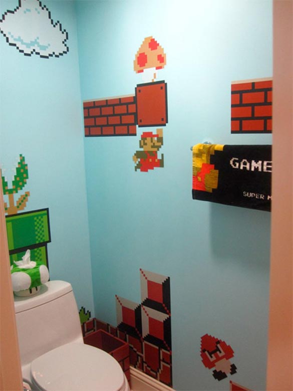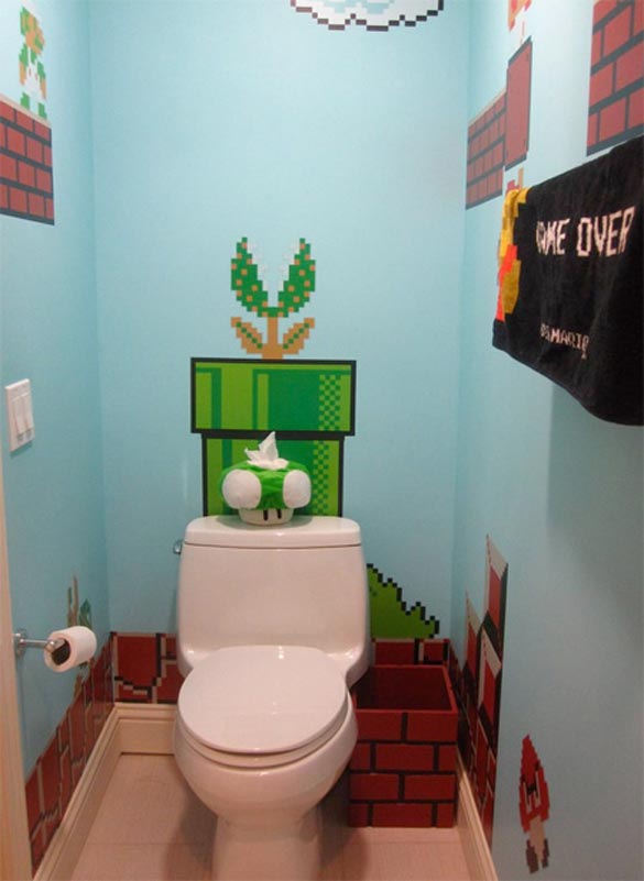 Сигурно се сеќавате на играта „Супер Марио“, една од најпознатите игри која постојано ја игравме на нинтендо. Инспирирајќи се од минатото, Лиат одлучила својата бања да ја трансформира во „Супер Марио“ тематски простор. Погледнете колку интересно изгледа. Налепниците и предметите од овој тоалет носталгично ќе ве потсетат на детството.