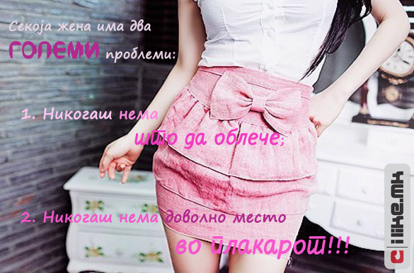 03.09.2011 /Постирано во Мисла на денот /Автор: Елизабета Илковска /4 коментари Жената има два ГОЛЕМИ проблеми Секоја жена има два големи проблеми… Станете наш facebook фан. Ви Благодариме! « Претходно Во оваа куќа.. Следно » Убавите и интелигентни жени