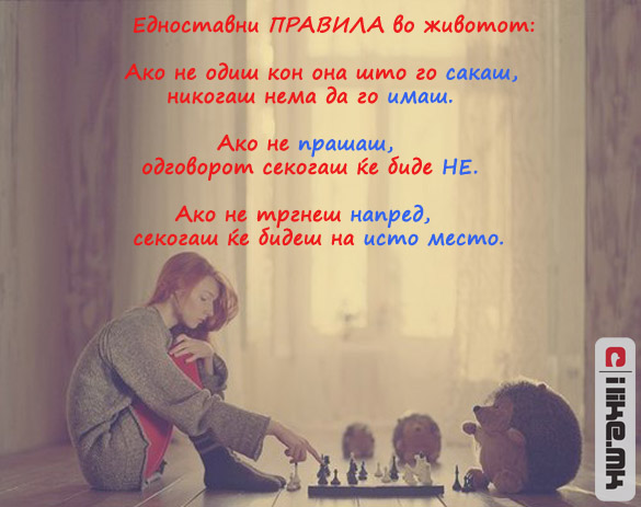 05.02.2012 /Постирано во Мисла на денот /Автор: Елизабета Илковска /Оставете коментар Едноставни правила во животот! Едноставни правила во животот… Кликнете ТУКА за да ги погледнете нашите денешни содржини. Станете наш facebook фан. Станете наш facebook фан. Ви Благодариме! « Претходно Луѓето не сфаќаат колку се богати… Следно » Прстот кој ти ги брише солзите…