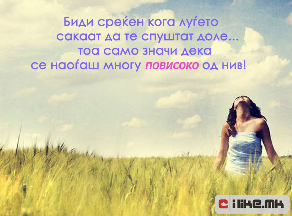 11.01.2012 /Постирано во Мисла на денот /Автор: Елизабета Илковска /Оставете коментар Кога сакаат да те спуштат доле… Кога луѓето сакаат да те спуштат… Кликнете ТУКА за да ги погледнете нашите денешни содржини. Станете наш facebook фан. Станете наш facebook фан. Ви Благодариме! « Претходно Не се плаши! Следно » Луѓето измислиле милион начини…