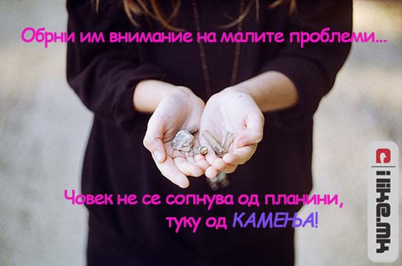 17.10.2011 /Постирано во Мисла на денот /Автор: Елизабета Илковска /Оставете коментар Обрни им внимание на малите проблеми! Обрни им внимание на малите проблеми.. Кликнете ТУКА за да ги погледнете нашите денешни содржини. Станете наш facebook фан. Станете наш facebook фан. Ви Благодариме! « Претходно Ако некогаш паднеш.. Следно » Постојат милиони..