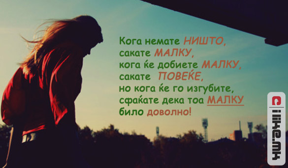 02.11.2011 /Постирано во Мисла на денот /Автор: Елизабета Илковска /Оставете коментар Тоа малку било доволно! Кога немате ништо… Кликнете ТУКА за да ги погледнете нашите денешни содржини. Станете наш facebook фан. Станете наш facebook фан. Ви Благодариме! « Претходно Кому да му верувате? Следно » Не го барај најубавиот на светот!