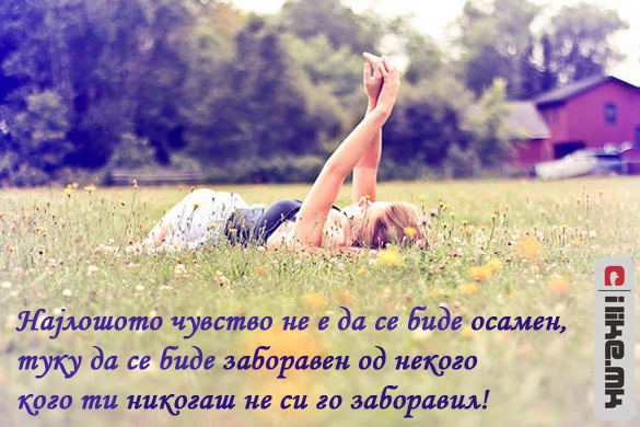04.05.2012 /Постирано во Мисла на денот /Автор: Елизабета Илковска /Оставете коментар Најлошото чувство не е да се биде осамен! Најлошото чувство не е да се биде осамен… Кликнете ТУКА за да ги погледнете нашите денешни содржини. Станете наш facebook фан. Станете наш facebook фан. Ви Благодариме! « Претходно Најгласниот плач на жената… Следно » Луѓето велат: „Си се сменил“