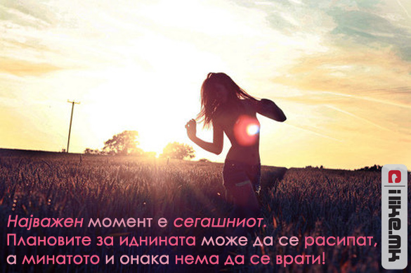 06.06.2012 /Постирано во Мисла на денот /Автор: Елизабета Илковска /Оставете коментар Најважен момент е сегашниот Најважен момент е сегашниот… Кликнете ТУКА за да ги погледнете нашите денешни содржини. Станете наш facebook фан. Станете наш facebook фан. Ви Благодариме! « Претходно Еден поглед и една насмевка… Следно » Понекогаш луѓето не го ценат…
