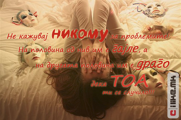 31.08.2011 /Постирано во Мисла на денот /Автор: iLike.mk /Оставете коментар Не кажувај никому! Не кажувај никому за проблемте! На половина од нив.. Кликнете ТУКА за да ги погледнете нашите денешни содржини. Facebook FAN page Станете наш facebook фан. Ви Благодариме! « Претходно Животот е како ВИНОЖИТО.. Следно » Вистинскиот пријател..