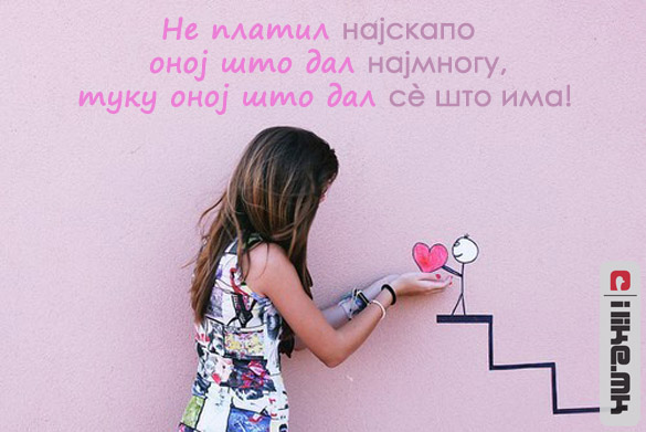 01.03.2012 /Постирано во Мисла на денот /Автор: Елизабета Илковска /Оставете коментар Не платил најскапо… Не платил најскапо оној… Кликнете ТУКА за да ги погледнете нашите денешни содржини. Станете наш facebook фан. Станете наш facebook фан. Ви Благодариме! « Претходно Ако молчам не значи дека… Следно » Во животот не губат…
