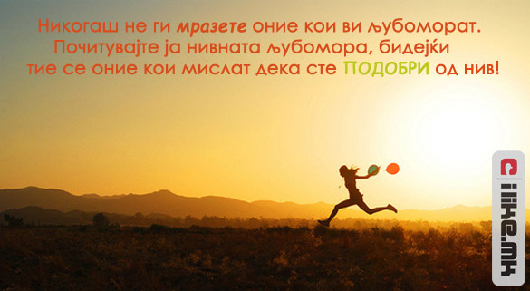 25.01.2012 /Постирано во Мисла на денот /Автор: Елизабета Илковска /1 коментар Не ги мразете оние кои ви љубоморат! Никогаш не ги мразете оние кои… Кликнете ТУКА за да ги погледнете нашите денешни содржини. Станете наш facebook фан. Станете наш facebook фан. Ви Благодариме! « Претходно Тајната на среќниот живот Следно » Само ТИ избираш!