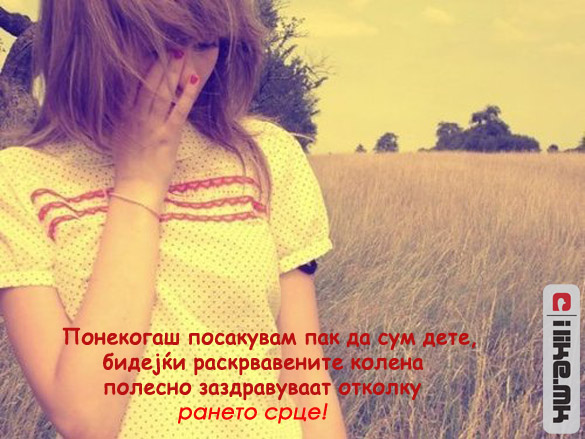 10.12.2011 /Постирано во Мисла на денот /Автор: Елизабета Илковска /Оставете коментар Пак да сум дете… Понекогаш посакувам пак да сум… Кликнете ТУКА за да ги погледнете нашите денешни содржини. Станете наш facebook фан. Станете наш facebook фан. Ви Благодариме! « Претходно Ако сакаш некого… Следно » Кога животната игра не ви носи задоволство…