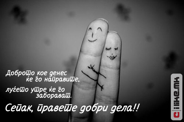 18.09.2011 /Постирано во Мисла на денот /Автор: Елизабета Илковска /Оставете коментар Правете добри дела!! Доброто кое денес ќе го направите… Кликнете ТУКА за да ги погледнете нашите денешни содржини. Станете наш facebook фан. Станете наш facebook фан. Ви Благодариме! « Претходно Што го издава човекот? Следно » Душа која те сака