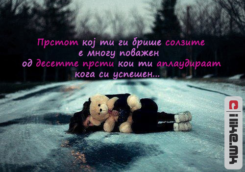 06.02.2012 /Постирано во Мисла на денот /Автор: Елизабета Илковска /Оставете коментар Прстот кој ти ги брише солзите… Прстот кој ти ги брише солзите… Кликнете ТУКА за да ги погледнете нашите денешни содржини. Станете наш facebook фан. Станете наш facebook фан. Ви Благодариме! « Претходно Едноставни правила во животот! Следно » Животот е како клавир!
