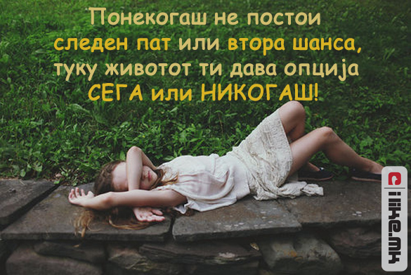 16.05.2012 /Постирано во Мисла на денот /Автор: Елизабета Илковска /Оставете коментар СЕГА или НИКОГАШ! Понекогаш не постои… Кликнете ТУКА за да ги погледнете нашите денешни содржини. Станете наш facebook фан. Станете наш facebook фан. Ви Благодариме! « Претходно Довербата е како огледало Следно » Во животот треба да ризикувате!