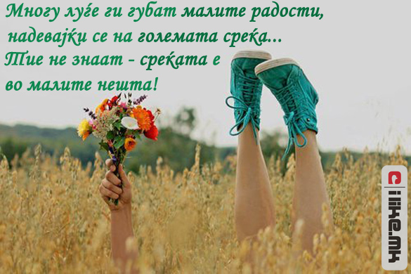 25.04.2012 /Постирано во Мисла на денот /Автор: Елизабета Илковска /Оставете коментар Среќата е во малите нешта! Многу луѓе ги губат… Кликнете ТУКА за да ги погледнете нашите денешни содржини. Станете наш facebook фан. Станете наш facebook фан. Ви Благодариме! « Претходно Не му се потсмевајте! Следно » Бог го создал мажот посилен од жената
