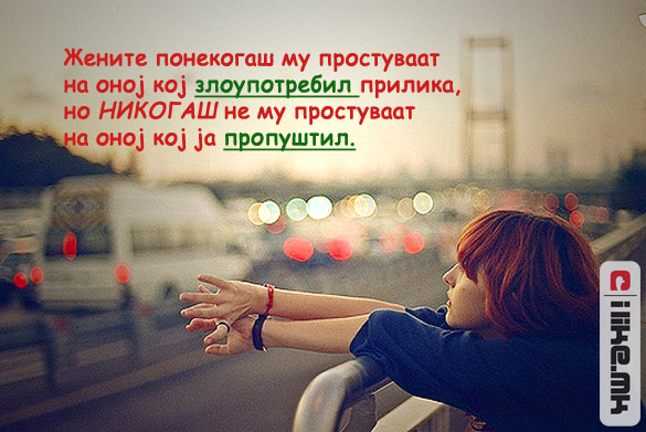 09.11.2011 /Постирано во Мисла на денот /Автор: Елизабета Илковска /Оставете коментар Што простуваат жените? Жените понекогаш му простуваат.. Кликнете ТУКА за да ги погледнете нашите денешни содржини. Станете наш facebook фан. Станете наш facebook фан. Ви Благодариме! « Претходно Зар можеш да ја заборавиш љубената личност? Следно » Кога силно сакаш..