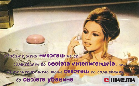 04.09.2011 /Постирано во Мисла на денот /Автор: Елизабета Илковска /Оставете коментар Убавите и интелигентни жени Убавите жени никогаш не се сомневаат… Кликнете ТУКА за да ги погледнете нашите денешни содржини. Facebook FAN page Станете наш facebook фан. Ви Благодариме! « Претходно Жената има два ГОЛЕМИ проблеми Следно » Учете од децата!!!