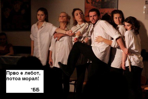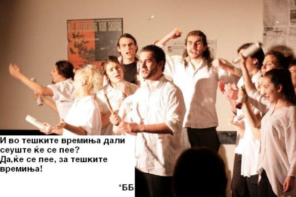 Оркестар Б.Б. (Бертолд Брехт) може да се разбере како еден коментар што си поигрува со политичките, социјалните и воопшто стереотипите кои произлегуваат од меѓучовечките односи. Игра голема актерска екипа која лесно развива апсурдни ситуации кои зборуваат за стварноста што не опрукужува и точно ја отсликуваат сегашната политичка локална и глобална хаотичност. Преку музика и сонгови сето ова е исполнето од: Мирослав Петковиќ, Ненад Митевски, Атанас Атанасовски, Тина Трпкоска, Наташа Петровиќ, Кристина Ласовска, Марија Стефановска, Ана Кафкалеска, Катерина Аневска, Катерина Чакмакоска и Слаѓана Вујошевиќ. Режијата е на Владо Цветановски и Мими Таневска.