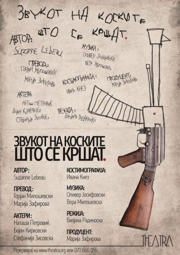 “Звукот на коските што се кршат“ ја раскажува приказната од еден дневник, за две деца, за две изгубени детства, за војна, за терор, за страв, за храброст, за издржливост, за чиста љубов. Иако оригинално сместена во централна Африка, борбата, страдањето и храброста на ликовите се безвременски и безпросторни. Претставата опфаќа тема која не може лесно да се прераскаже, потребно е да се доживее. Ова не е приказна што завршува со гаснење на последното светло во театарот, не е текст кој завршува со последната страна. Ова е претстава која носи некој горчлив вкус кој останува, некоја празнотија под која се крие неописливо тежок товар, како солзите да не се доволни да исплакнат сѐ што е почувствувано.