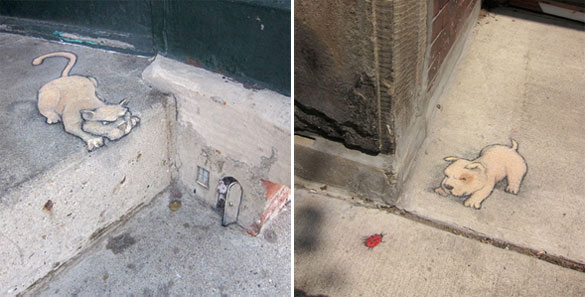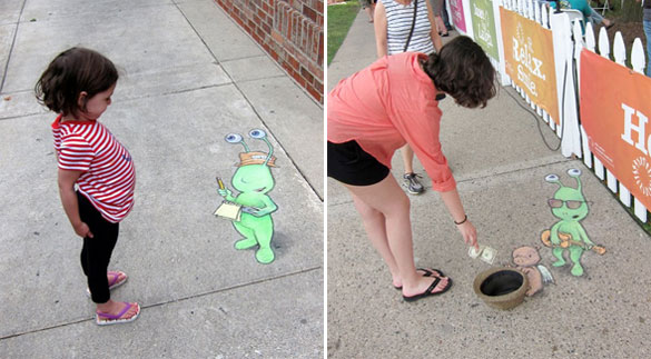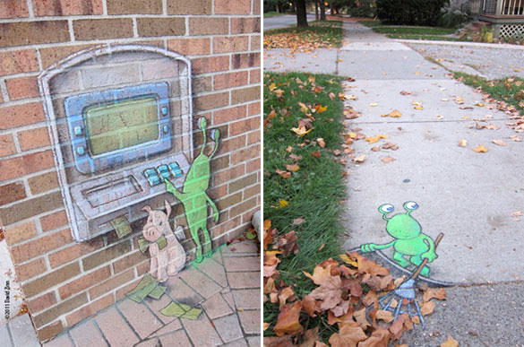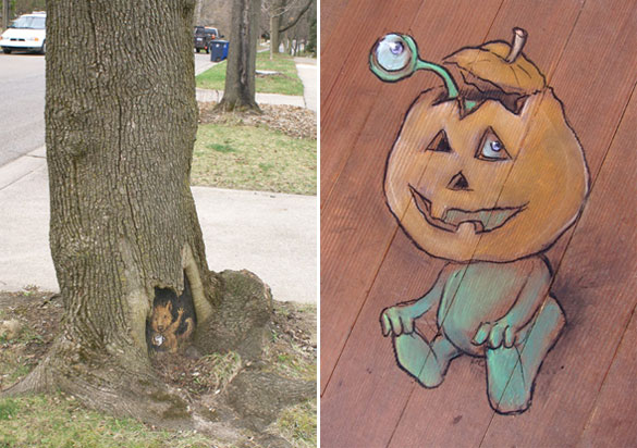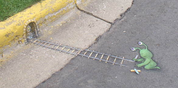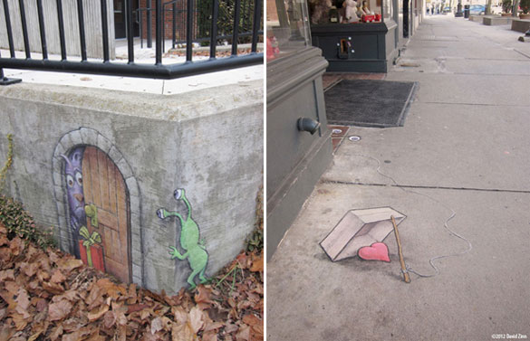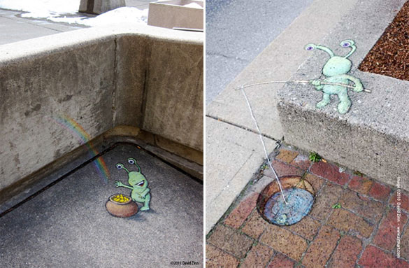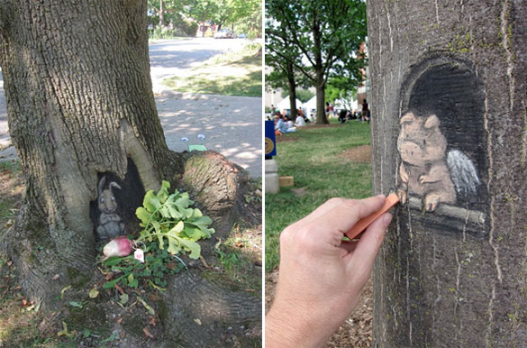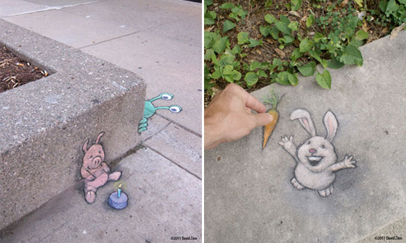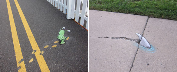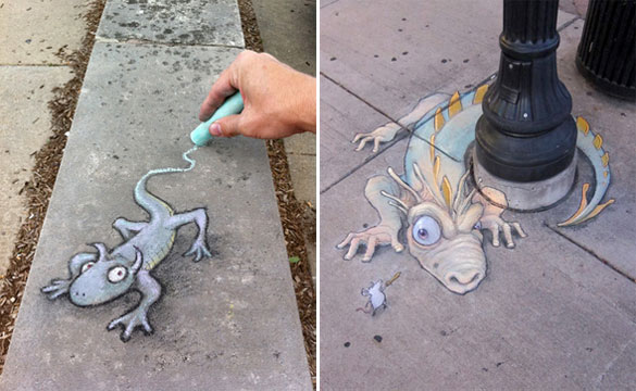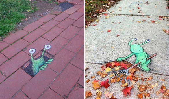 Овие интересни и креативни цртежи кои се изработени со креда се дело на талентираниот американски уметник David Zinn. Чудните суштества ги нацртал на скали, ѕидови, дрва и тротоари во Мичиген. Жално е само што првиот дожд ќе ги избрише.