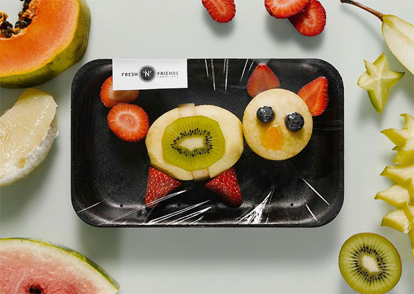 Германскиот синџир на супермаркети Fresh`N´Friends е нарачател на оваа кампања која има за цел да ги привлече децата и нивните родители да купуваат свежа и здрава храна. Парчињата овошје се наредени во интересни форми на слатки животни и карактери, кои несомнено ќе ги забележат дечињата. Ова паметно пакување е дизајнирано од Scholz&Friends.