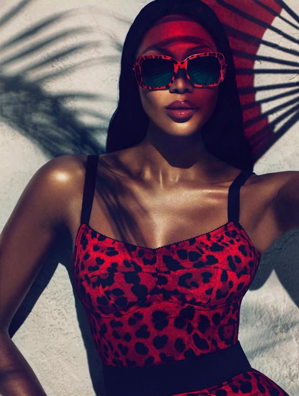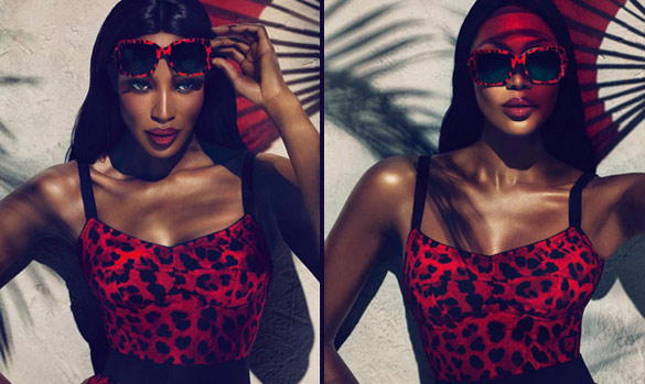 Црната тигрица Наоми Кембел имаше чест прва да ги носи очилата за сонце од најновата колекција на Dolce & Gabbana. Нивната пролетна колекција е потпишана како Animalier. Наоми позираше пред објективите на Мерт Алас и Маркус Пигот. Новата линија на D&G ни носи три вида на очила: пилотски, големи очила типични за 60-тите години и очила со заоблени рамки во боите на пурпурната орхидеа и сафирот.