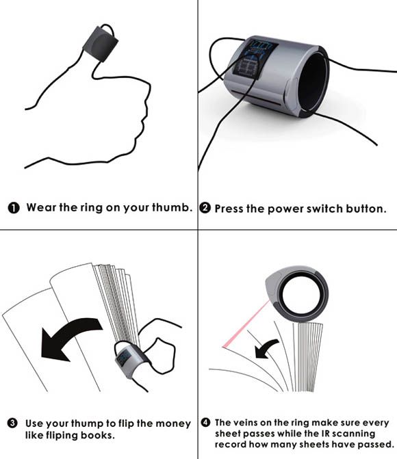 Интересен компактен прстен е една нова иновација во креативниот свет. Овој бројач е значително поедноставен отколку машината за броење пари. Само треба прстенот дa го ставите на палецот, да го вклучите и да го земете купчето со пари.