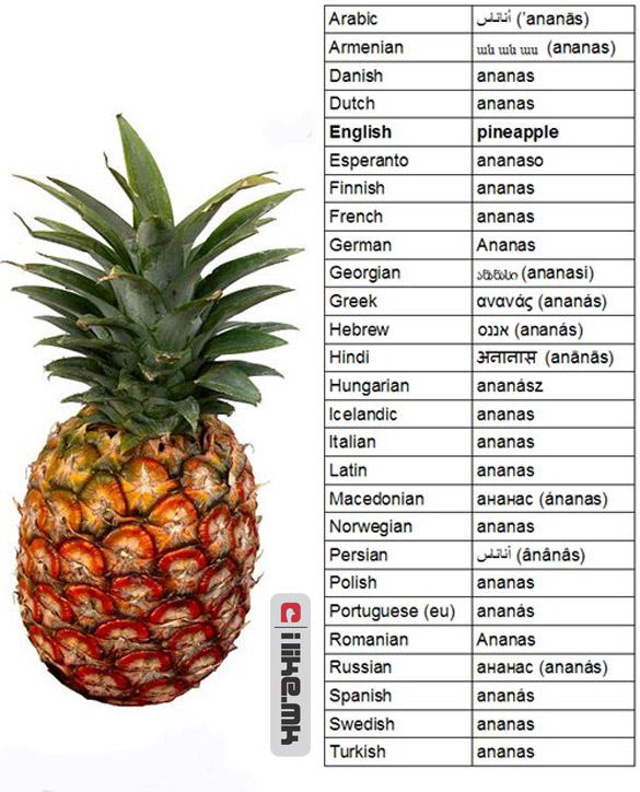 Во табелата на фотографијава е напишан зборот „ананас“ на 27 јазици. Иако постојат разлики во пишаната форма, сепак исто се изговара на 26 од наведените јазици (со мала разлика во Eсперанто, каде се изговара „ананасо“). Значи од вкупно наведените 27 јазици, само на англиски јазик постои голема разлика како во пишаната, така и во говорната форма. Отсега, ќе знаете дека кога ќе го изговорите овој збор во 26 држави ќе ве разберат што сакате. 🙂