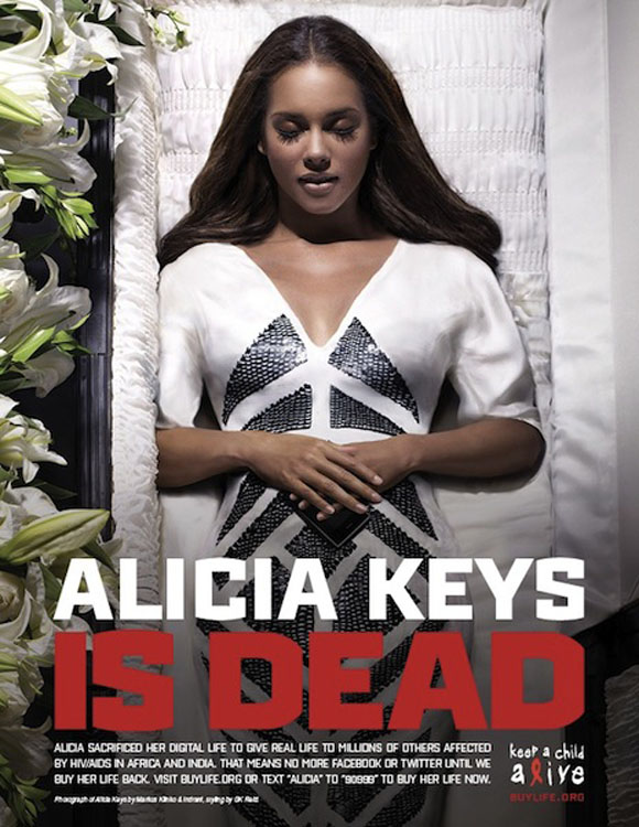 По повод светскиот ден на борба против сидата фондацијата на Alicia Keys, Keep a Child Alive прави кампања наречена “Digital Life Sacrifice” за подигање на свеста и собирање средства за да помогнат во спасувањето животи на деца заболени од сида во Индија, Кенија, Руанда, Уганда и Јужна Африка. Lady Gaga, Justin Timberlake, Kim Kardashian и Usher се само дел од ѕвездите кои ѝ се придружија на Alicia, и го жртвуваат својот дигитален живот за да спасат илјадници други. Тие нема да ги користат социјалните мрежи како twitter и facebook се додека не соберат 1 милион долари. За да ги воскреснат, фановите можат да ја посетат buylife.org и да донираат пари.