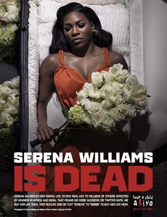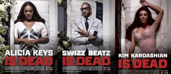 Дел од кампањата се и по малку морбидните рекламни постери на кои ѕвездите лежат во ковчези.