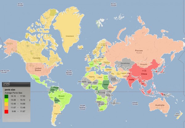 Станува збор за мапа на светот чие обојување на државите е во зависност од просечната должина на машкиот полов орган.