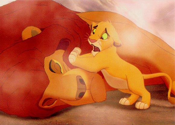 Скар го убива таткото на Симба и се качува на тронот додека Симба бега.