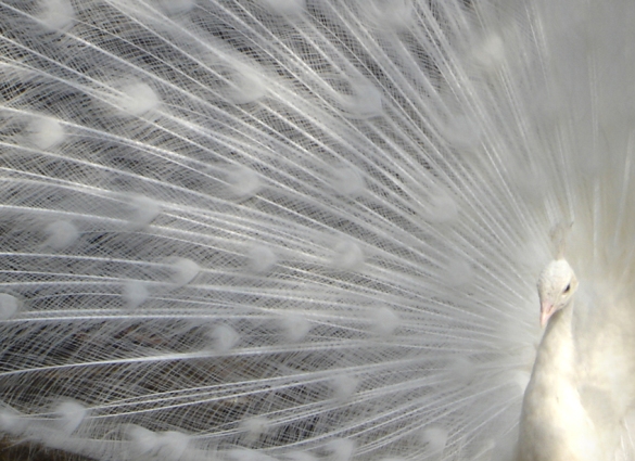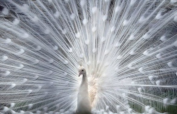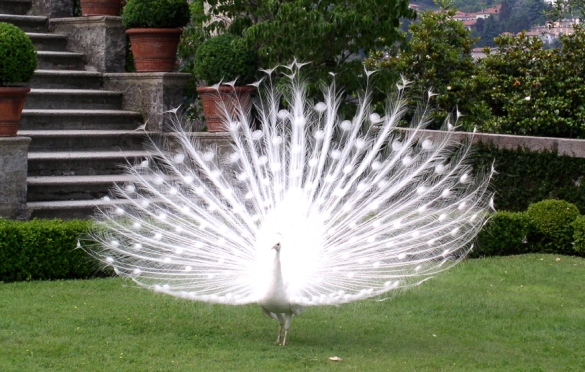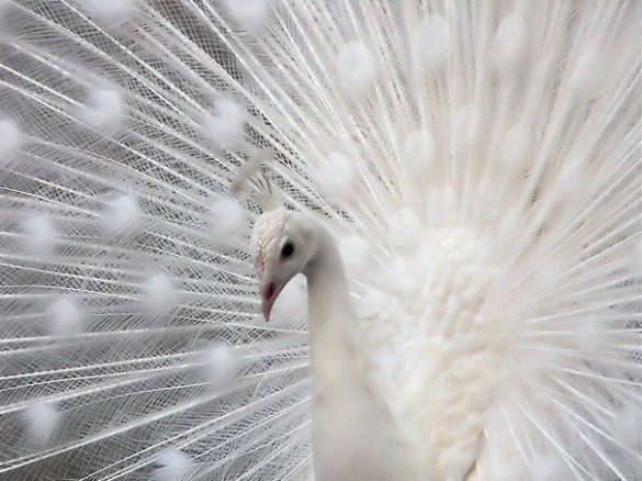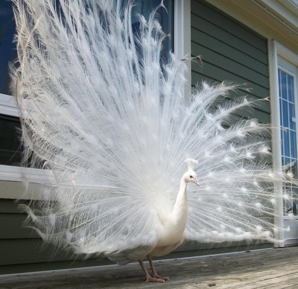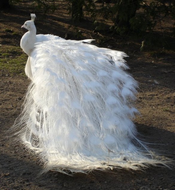 Погледнете неколку фотографии од прекрасни бели (албино) пауни кои се многу редок вид и специфични за одгледување поради нивната преголема осетливост на климатските промени и неможност за адаптација. Отварањето на раскошната бела опашка е знак на додворување.