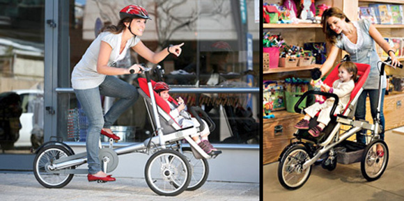 Верувам дека понекогаш и нa мајките им е здосадено бавното туркање на бебешката количка. Еве еден интересно дизајниран велосипед-количка. Можете да возите велосипед, истовремено шетајќи го бебето, а кога сакате да прошетате, само склопете го велоспидеот и останува само бебешката количка. Интересна идеја 🙂