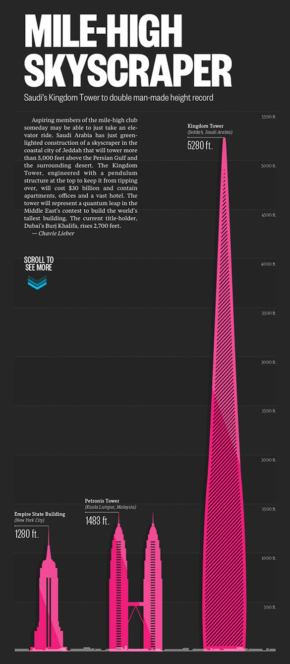 Саудиска Арабија ќе ја има највисоката зграда во светот, лоцирана во Џеда. Објектот ќе се издига во висина од 1.609 метри од земја. Проектот е дело на Kingdom Holding Company, а работното име на оваа грдосија е “Kingdom Tower“. Објектот вклучува 12 милиони кубни метри простор кој е планиран за станови, деловен простор, неколку хотели, маркети и болница. Врвот е резервиран за ветерници и поставување колектори. Со нив зградата ќе произведува енергија за потребите на сите станари. Во продолжение погледнете ја визуелизацијата.