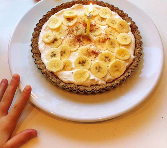 Филот нанесете го на претходно изладениот пандишпан. Врз филот исецкајте ја другата банана на кругови. Така подготвената пита ставете ја во фрижидер убаво да се олади.