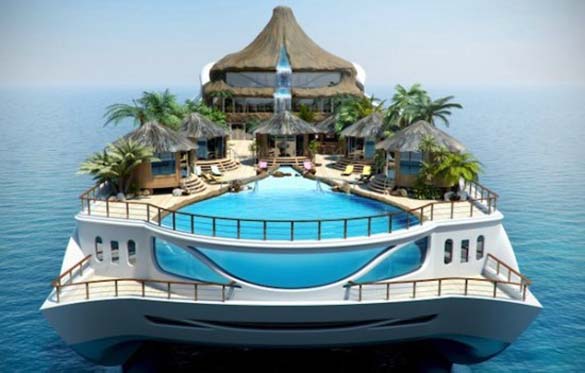 Неверојатна јахта која е во облик на тропски остров, дизајнирана од британска фирма. Јахтата на себе има се што ви треба за совршен одмор, такашто нема ни да имате потреба да се симнувате од неа. Таа има одличен базен, со апартмани околу него, и поглед кон вулканот на врвот од јахтата. Конструкцијата е од челик, а јахтата има должина од 90 метри. Погледнете ги фотографиите.